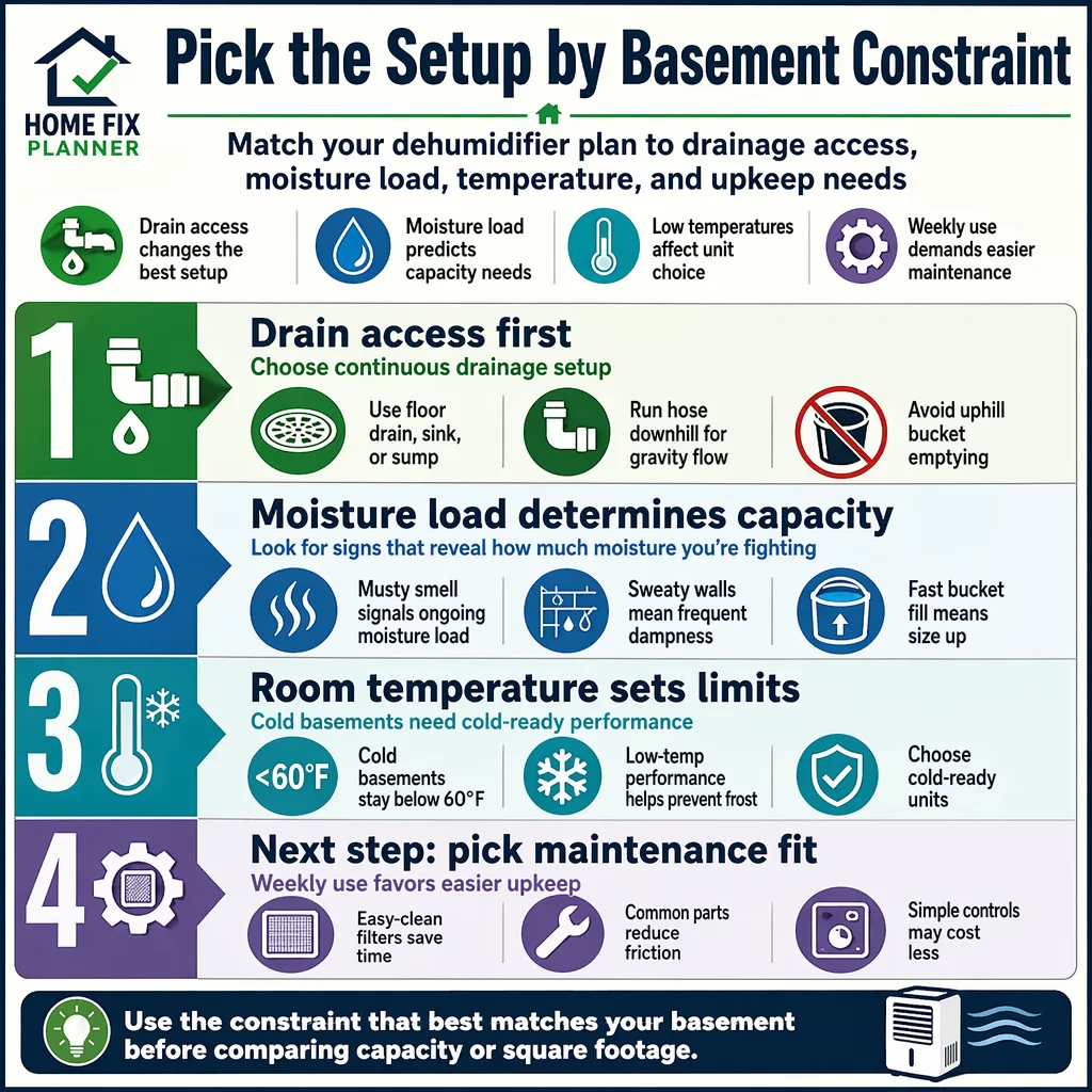 Start with wetness level and drain access, then size the machine. For many damp basements, a 50-pint class dehumidifier with continuous drainage is the cleanest ownership choice. For basements that stay wetter, store boxes, or need less babysitting, the 70-pint class with a pump earns its place.