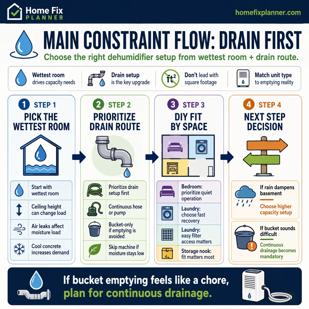 Choose the simpler setup when the room runs only after storms or humid spells. Choose the easier drain path when the machine sits in a damp basement, near laundry equipment, or anywhere daily attention disappears.