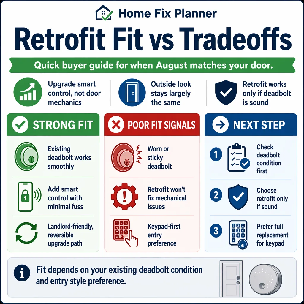 The better mental model is this: August upgrades access, not hardware rehab. If the door already needs a fresh lock body, the retrofit advantage disappears fast.