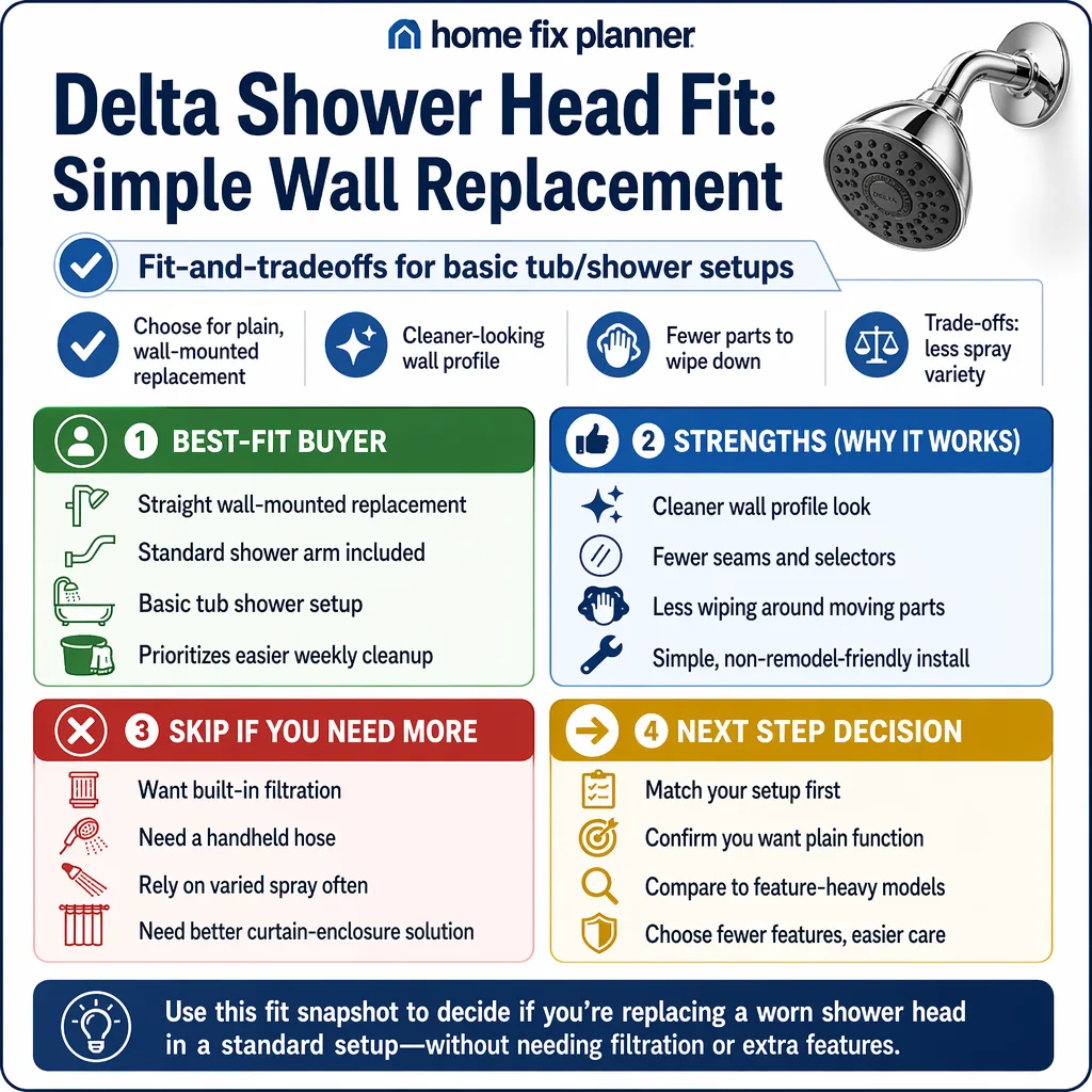 delta shower head fits the buyer who wants a straightforward wall-mounted replacement and cares more about cleanup than bells and whistles. It makes the most sense in a standard shower where the main job is to replace a worn head with something cleaner-looking and easier to live with.