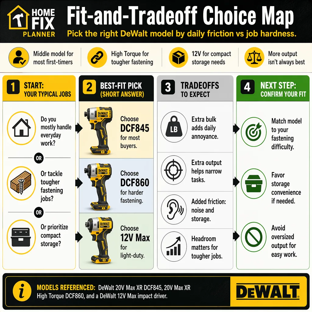 | Best DeWalt Impact Driver Overall | DeWalt 20V Max XR DCF845 | Most homeowners who want one driver for mixed repairs | Not the first choice for frequent heavy fastening |
