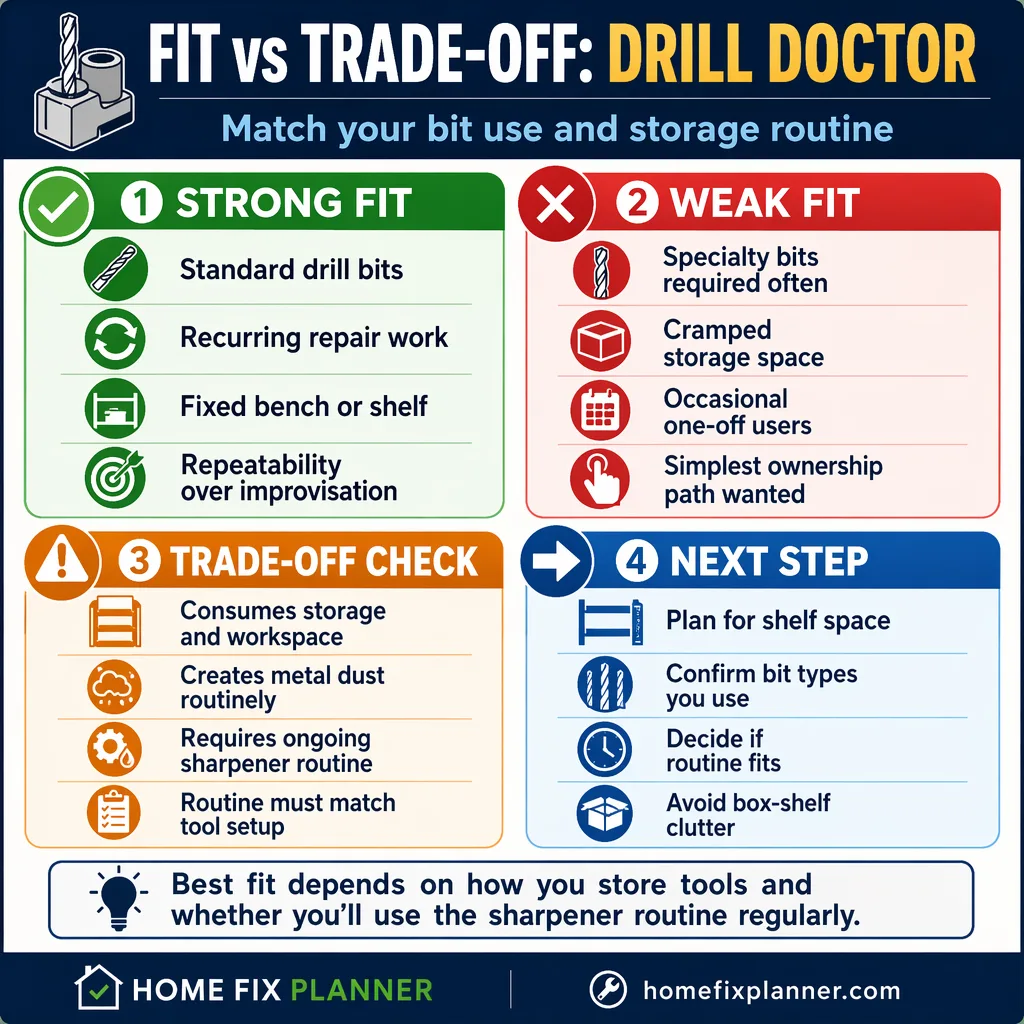Drill Doctor is a smart buy for homeowners who sharpen standard twist bits often and want repeatable results without freehand grinding. The fit changes fast if your bit drawer is mostly specialty shapes, if you only dull a few drills each year, or if your garage has no permanent home for another benchtop tool. The real decision is ownership friction, because a sharpener adds cleanup, storage, and parts upkeep to the job.