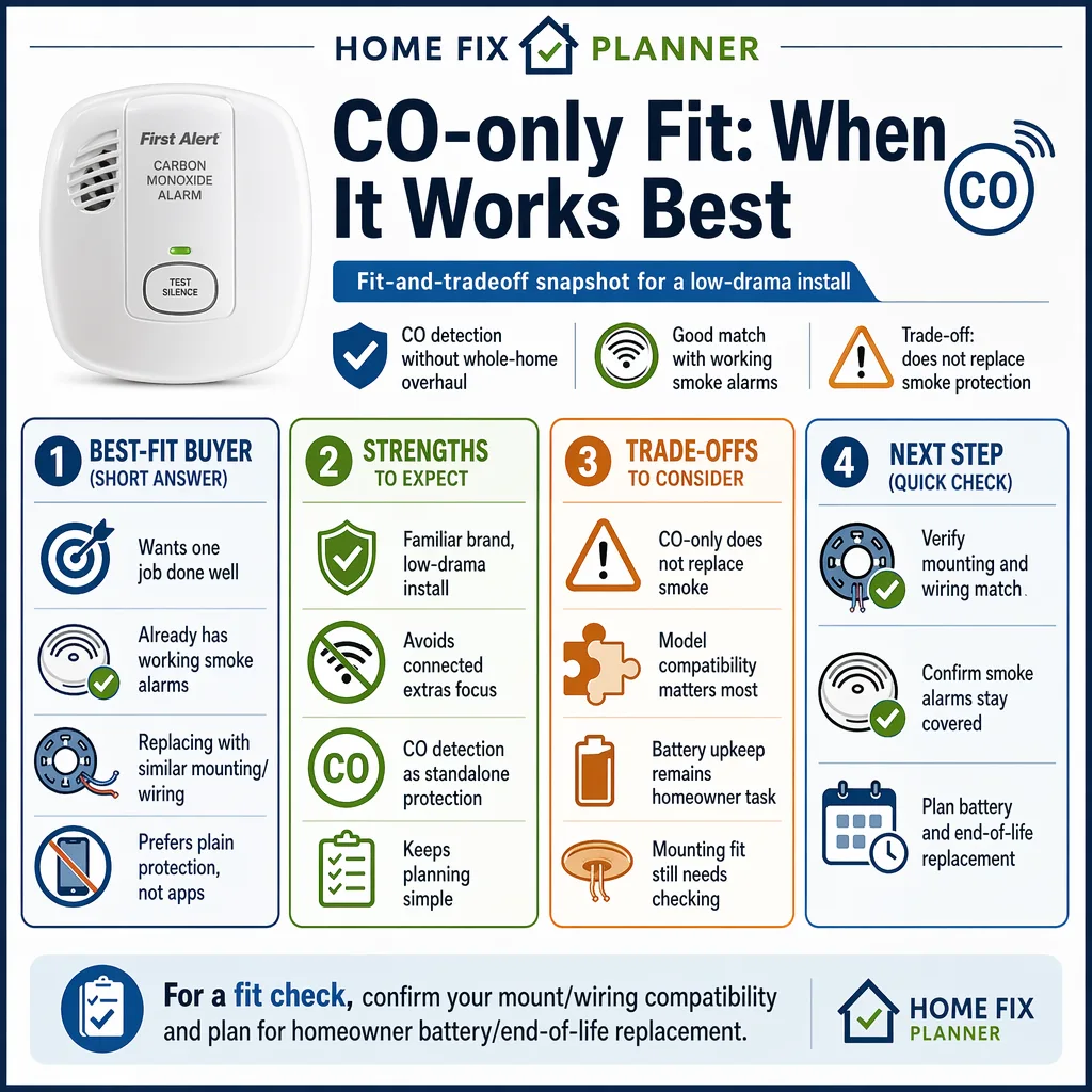 Yes, the First Alert Carbon Monoxide Alarm is a sensible buy for homeowners who want straightforward CO protection and a simple replacement path. That answer changes fast if the exact unit is battery-only, hardwired, or a combo detector, because setup and upkeep change with each format. It also changes if the house still lacks working smoke alarms, because a CO alarm solves a different hazard.