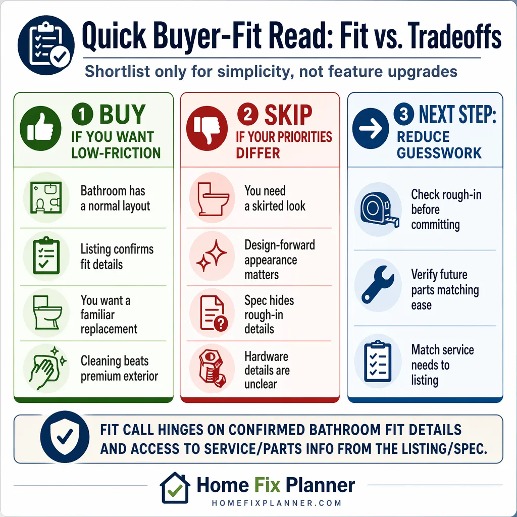 Do not start with this model if the bathroom has a questionable flange, an uneven floor, or tight side clearances. A toilet with vague dimensions turns a normal swap into a return haul, and that is a bad trade for any first-time buyer.