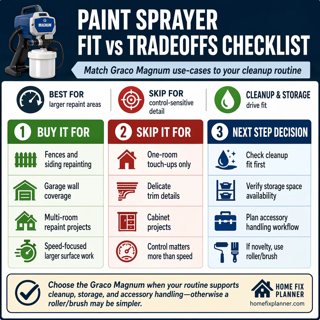 The real decision is not spray power. It is whether cleanup, storage, and accessory handling fit your routine. If the sprayer becomes a one-time novelty, a roller and brush win on simplicity.