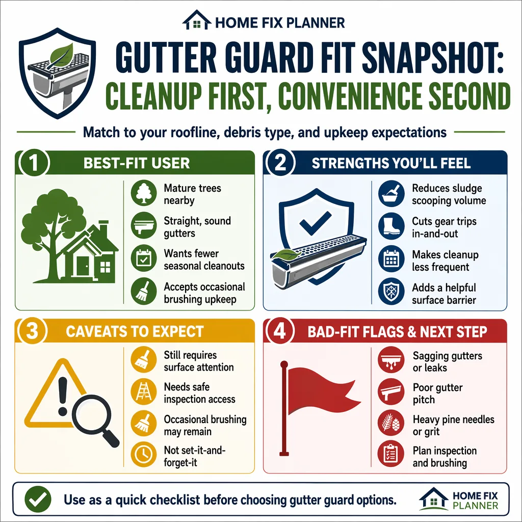 The gutter guard is a sensible buy for homes that fill gutters with leaves, but only when the gutter system itself is sound. The answer flips fast if the roof sheds heavy grit, the gutters sag, or the buyer expects a zero-maintenance fix. Most guides sell guards as a permanent solution, that is wrong because debris still lands on the top edge, in corners, and at downspouts. The real payoff is fewer ladder trips and less wet mess, not the end of gutter care.