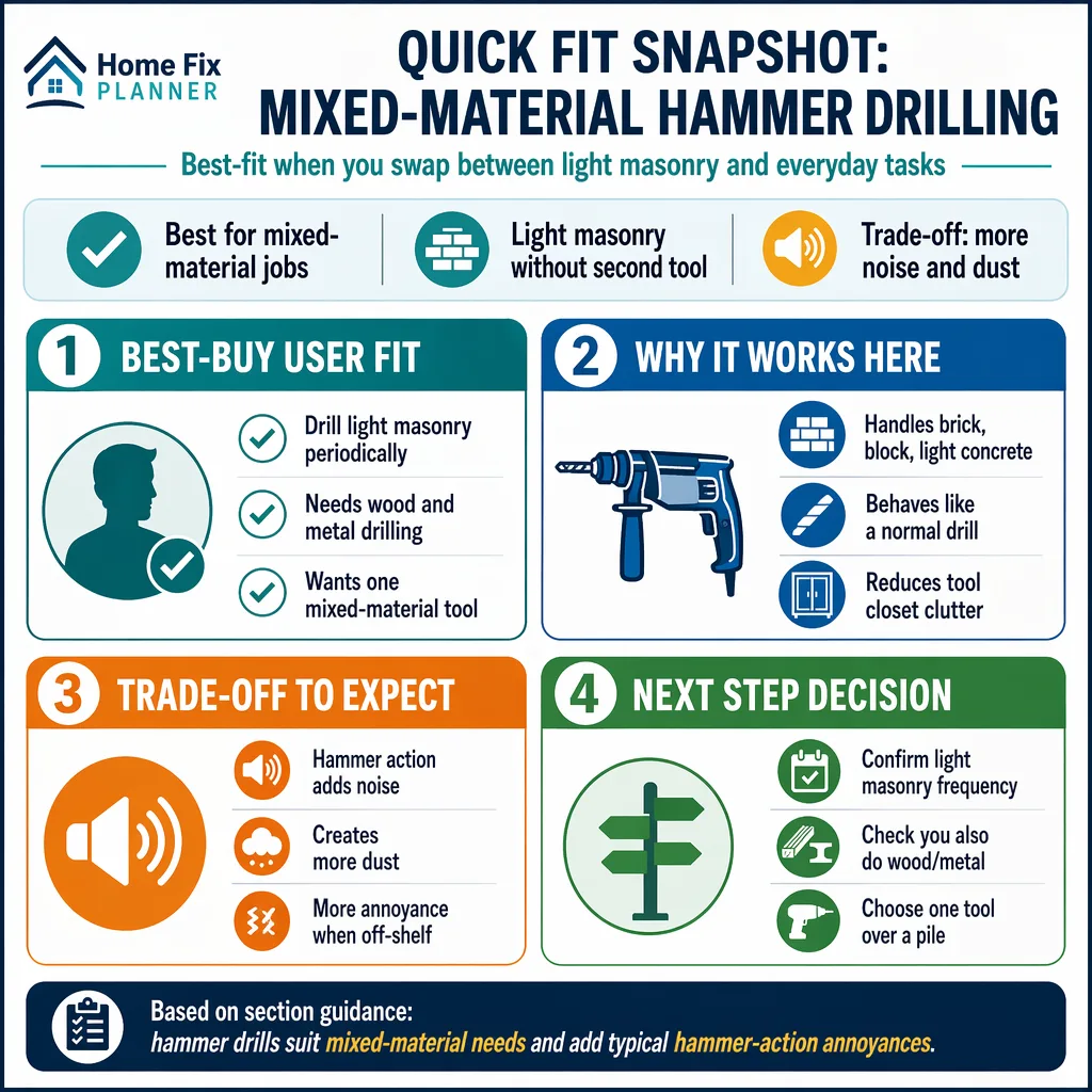 Best-fit scenario You need to drill brick, block, or light concrete a few times a year, you still want a drill for wood and metal, and you want one tool to cover both jobs without building a bigger tool pile.