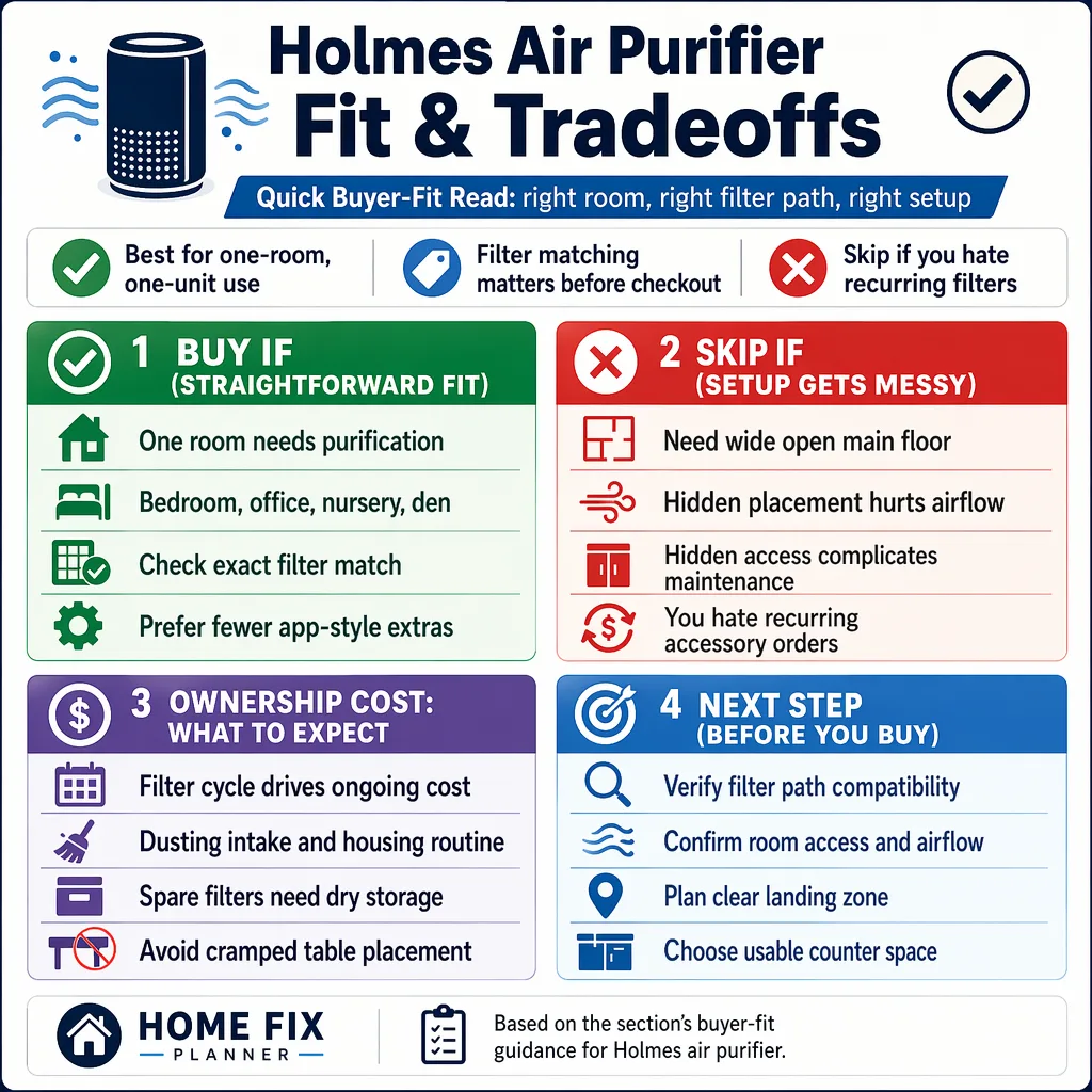 Holmes deserves a buy for a single-room shopper who wants a plain purifier and accepts regular filter upkeep. It loses the deal when the room is open, the placement is awkward, or the replacement-filter path is fuzzy.