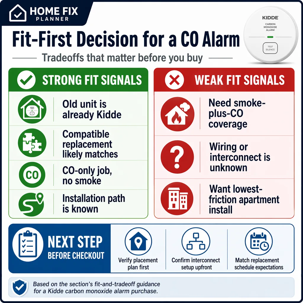Buy the Kidde alarm if you are replacing a matching unit, building a consistent detector setup in a house, or adding CO-only coverage with a known install path. Skip it if you need smoke detection too, face unknown hardwired compatibility, or want the cleanest renter-friendly install.