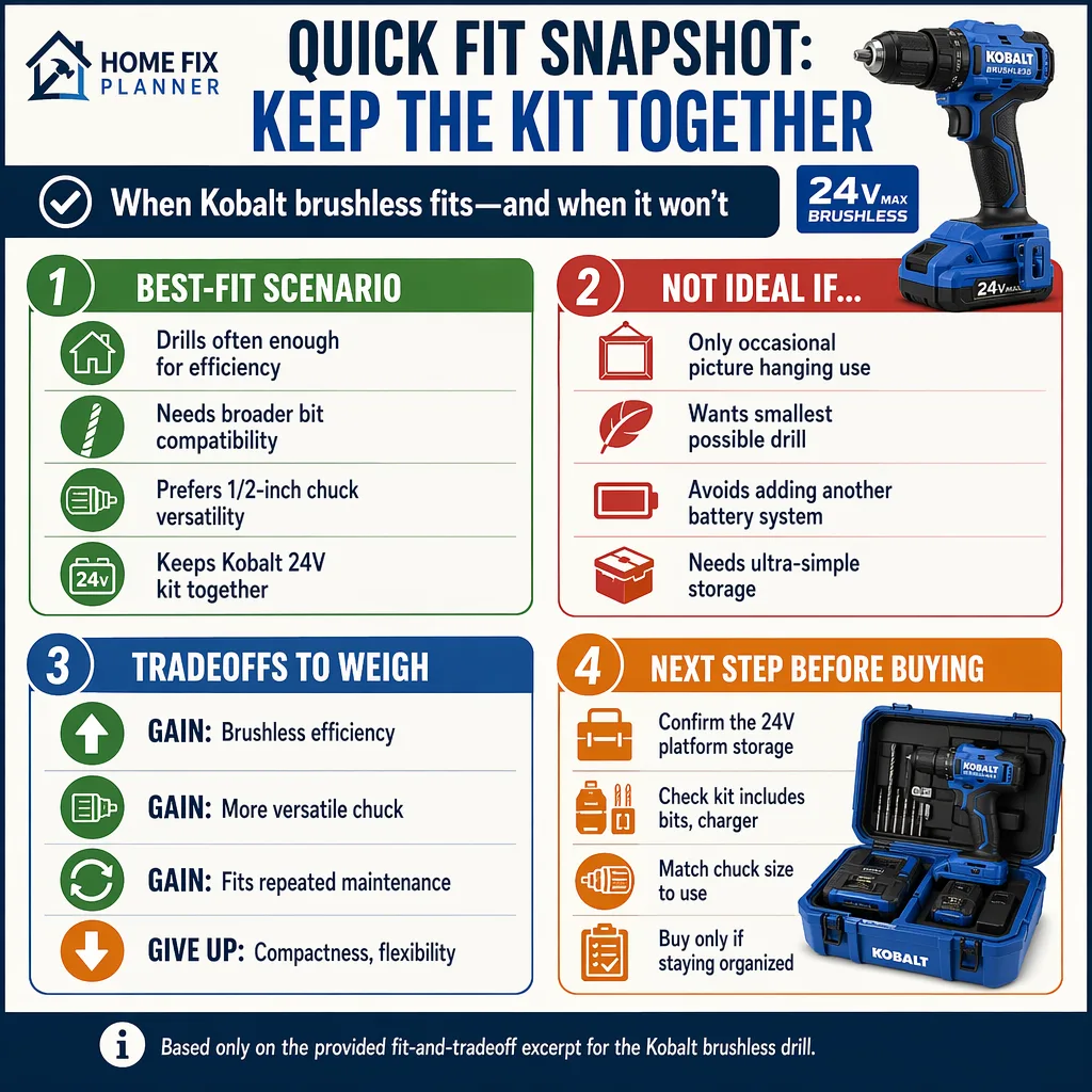 Yes, Kobalt XTR 24-volt 1/2-in Keyless Brushless Cordless Drill KXDD 1424A-03 makes sense for homeowners who want one cordless drill to handle recurring repairs and already plan to stay in Kobalt’s 24V battery system. The answer changes fast if you want the lightest drill in the cabinet or a bargain tool for rare, one-off tasks. It also changes if you prefer a brand that already powers your other tools, because the real cost sits in the platform, not just the drill body.