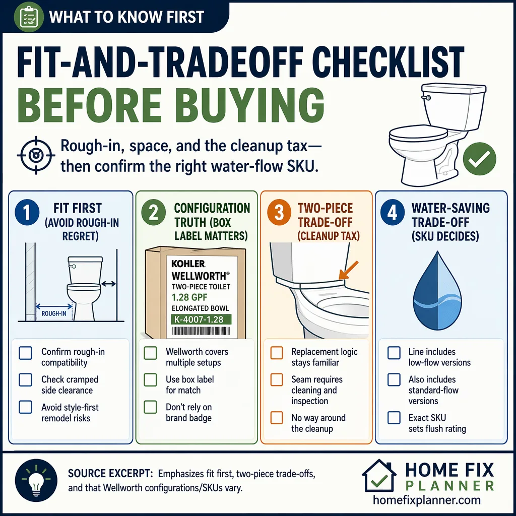 The Kohler Wellworth Toilet is a sensible buy for a standard replacement job where fit, serviceability, and easy parts matter more than a fancy silhouette. That answer changes fast if the bathroom needs a 10-inch or 14-inch rough-in, a skirted base, or a bowl shape that crowds a tight floor plan. It also changes if the room is a remodel centerpiece, because the Wellworth buys practical ownership, not a premium look.