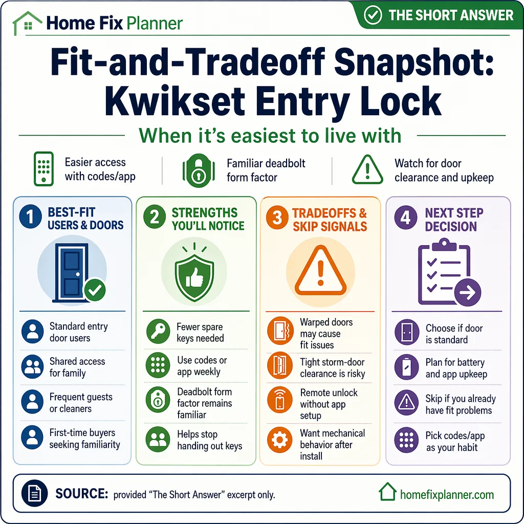 Yes, a Kwikset smart lock is a sensible buy for a standard front door if you want keyless entry without turning the project into a full security rebuild. The answer changes if your door prep is off, if you need remote access from outside the house, or if you want the lightest upkeep possible. Kwikset splits its lineup across keypad-first, Bluetooth, Wi-Fi, and smart-home paths, so the right model depends on how much convenience you will actually use.