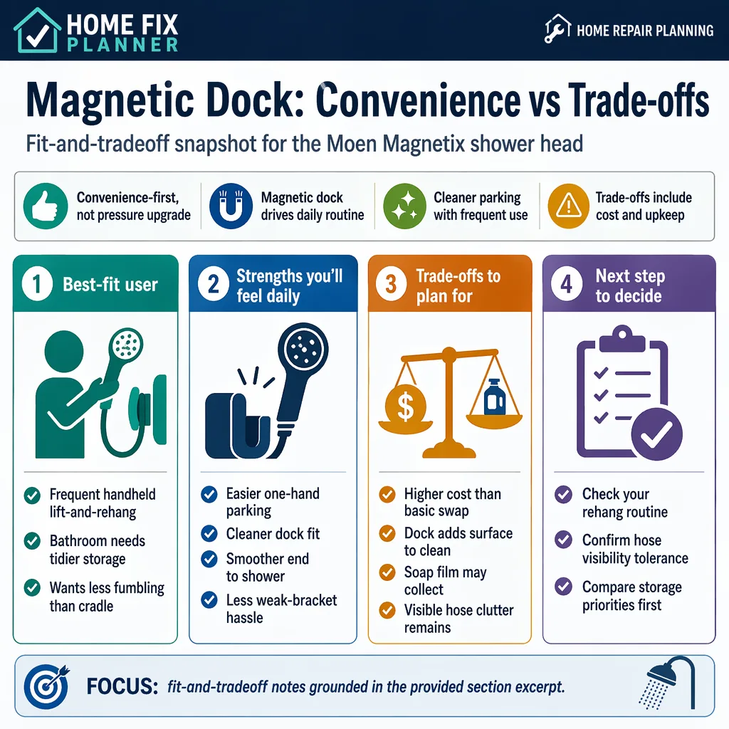 The moen magnetix shower head is a sensible buy for a bathroom that gets frequent handheld use and needs cleaner storage after every shower. It loses appeal when the shower already works as a simple fixed setup, or when the goal is the lowest-cost replacement. The magnetic dock earns its keep by cutting the little annoyances around parking, rehang, and cleanup. If the hose has tight clearance, the wall arm is worn, or the head never leaves the bracket, the value drops fast.
