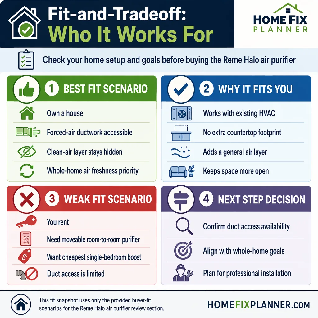 The reme halo air purifier is a sensible buy for homeowners with central HVAC who want whole-home air treatment and are fine paying for installation and upkeep. It stops making sense for renters, apartment dwellers, and anyone who wants a plug-in unit for a single room. The decision changes again if your ductwork is cramped, your HVAC service budget is tight, or you want a purifier you can move from room to room. Most guides frame this like a standard air purifier, and that framing is wrong because this product belongs in the HVAC system.