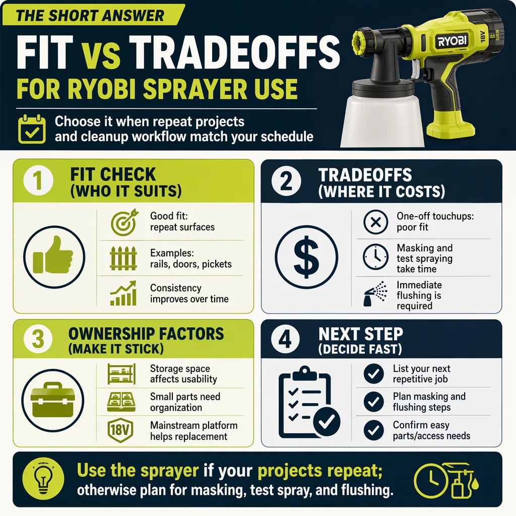 The Ryobi paint sprayer is a sensible buy for homeowners who want faster coverage on cabinets, fences, furniture, and other repeat paint jobs, but cleanup and storage discipline decide whether it feels smart or annoying. The answer flips fast if this is a one-off project, if the job is trim-heavy, or if the sprayer will sit on a shelf for long stretches between uses. It also changes if the finish needs tight control and low overspray, because a sprayer adds masking and setup that a brush never asks for.
