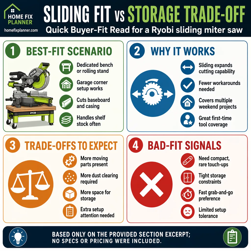 Yes, ryobi sliding miter saw makes sense for homeowners who want one saw that handles trim, shelving, and occasional framing without jumping to a contractor-grade price tier. The decision changes fast if the saw has to live in a cramped garage, get packed away after every cut, or sit unused for months at a time. Sliding miter saws buy flexibility, but they also charge a space and cleanup tax.