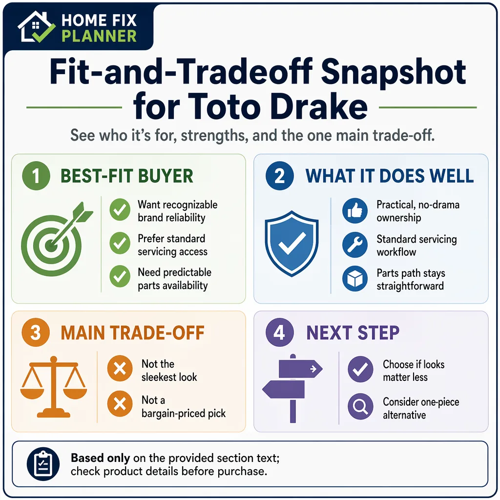 The Toto Drake Toilet is a sensible buy for homeowners who want a mainstream toilet with easy service, broad parts support, and fewer ownership surprises than a bargain-bin replacement. That answer changes fast if your bathroom is tight, because the common Drake layout does not solve cramped clearances. It also changes if the cleanest possible shell matters most, since the familiar two-piece build adds a seam that one-piece toilets avoid.