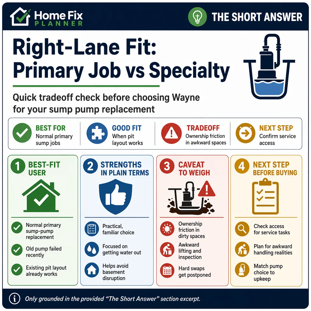 Wayne is a solid buy for a standard sump-pump replacement when the goal is simple protection and manageable upkeep. It belongs in homes where the pit has room, the plumbing is already sensible, and the owner wants a mainstream primary pump without turning the job into a custom project.